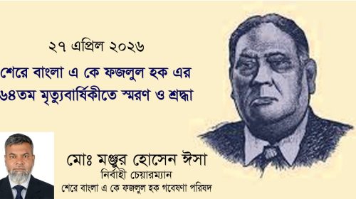 আগামী ২৭ এপ্রিল শেরে বাংলা একে ফজলুল হক এর ৬৪ তম মৃত্যু বার্ষিকীর স্মরণ ও শ্রদ্ধা